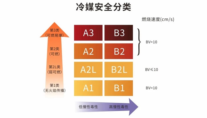 根據ASHRAE 34-2022標準,冷媒按毒性可分為A類(低慢性毒性)、B類(高慢性毒性),按可燃性可分為第1類(無火焰?zhèn)鞑?、第2L類(弱可燃)、第2類(可燃)、第3類(可燃易爆)。A2L是低毒弱可燃性冷媒,常見的有R32、R454A、R454B、R454C、R1234ze、R1234yf等。A3冷媒是高可燃性天然工質,常見的有R290等。為應對全球變暖問題,全球對高GWP冷媒的管控趨嚴,A2L和A3冷媒因低GWP特性成為全球制冷行業(yè)綠色轉型的必然選擇。