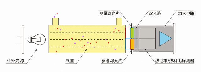 非分光紅外(NDIR)技術是利用氣體對特定波長紅外光的吸收特性來測量氣體濃度,檢測不同型號冷媒氣體只需選擇對應的特征吸收波段,具有選擇性好,抗干擾能力強,檢測精度高,壽命長,可靠性高等優(yōu)勢,但NDIR冷媒泄漏監(jiān)測傳感器因其相對復雜的設計使其尺寸在應用中存在局限性。