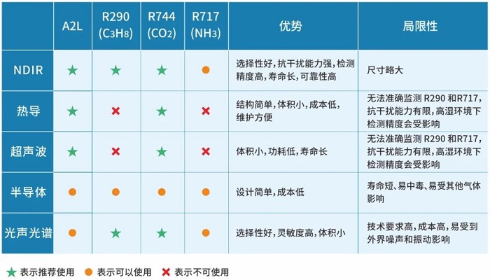 目前針對A2L/A3冷媒泄漏監(jiān)測的技術主要包括非分光紅外技術、熱導技術、超聲波技術、半導體技術和光聲光譜技術。