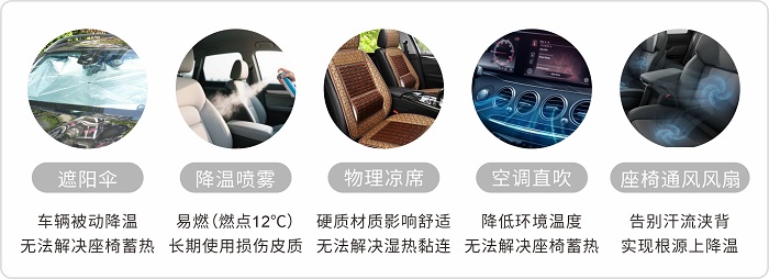 夏季常見的汽車遮陽傘、降溫噴霧、物理涼席等傳統(tǒng)方式無法實(shí)現(xiàn)對(duì)座椅的直接快速降溫。即便是將車內(nèi)空調(diào)風(fēng)力調(diào)到最大,人體環(huán)境溫度雖能下降,但與座椅深層接觸的背部和臀部因空氣不流通會(huì)悶熱難忍,尤其是開車久坐時(shí)易感到明顯不適。