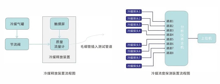 若經(jīng)驗(yàn)法則在復(fù)雜工況中存在不確定性,還可通過(guò)科學(xué)測(cè)試精準(zhǔn)錨定最佳安裝位?!陡戒汳M冷媒傳感器位置確認(rèn)測(cè)試》是UL定義的一項(xiàng)關(guān)鍵驗(yàn)證程序,基于測(cè)試要求研發(fā)設(shè)計(jì)的附錄MM實(shí)驗(yàn)裝置主要由冷媒釋放裝置和冷媒濃度探測(cè)裝置組成。冷媒釋放裝置能夠精確調(diào)控冷媒氣體的釋放流量,并借助毛細(xì)管將氣體精準(zhǔn)導(dǎo)入空調(diào)或熱泵的相應(yīng)管道之中。與此同時(shí),分布在測(cè)量設(shè)備不同位置的冷媒濃度探測(cè)裝置,可迅速捕捉各測(cè)量點(diǎn)的氣體濃度信息,并將數(shù)據(jù)以曲線圖形式實(shí)時(shí)呈現(xiàn)在上位機(jī)。通過(guò)對(duì)不同位置所測(cè)得的冷媒氣體濃度數(shù)據(jù)進(jìn)行分析,能夠科學(xué)地確定傳感器的最佳安裝位置。