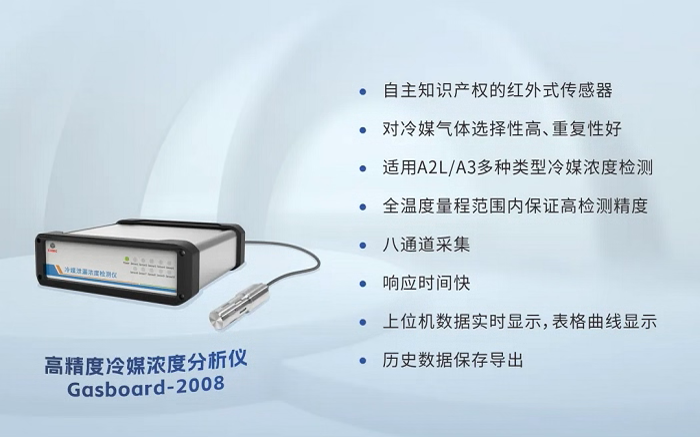 冷媒濃度探測(cè)裝置是四方光電自主研發(fā)的高精度冷媒濃度分析儀,采用紅外傳感器,共有8個(gè)檢測(cè)通道,可檢測(cè)多種A2L/A3冷媒,并通過(guò)上位機(jī)進(jìn)行實(shí)時(shí)數(shù)據(jù)顯示。