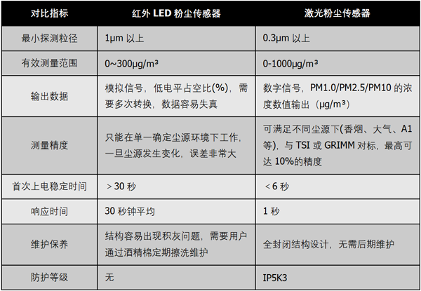 LED紅外粉塵傳感器與激光型粉塵傳感器的性能對比: