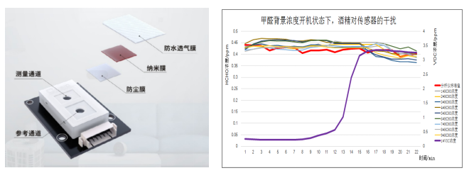 1、創(chuàng)造性的使用雙甲醛傳感器膜的檢測技術(shù),抗酒精等交叉氣體干擾,酒精干擾<1%,可同時輸出HCHO,TVOC,VOC,溫度,濕度參數(shù)。