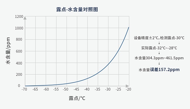 · 實際:露點與水含量呈非線性關(guān)系,露點越高,水含量差別越大。鋰電池車間露點通常在-60℃~-30℃,電容式傳感器檢測該區(qū)間誤差較大,如檢測露點為-30℃,水含量誤差高達(dá)157.2ppm。